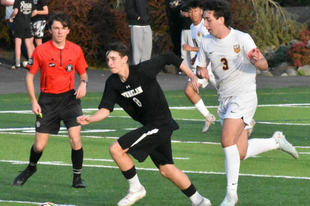 The Hornets from Pierce County came out on top Friday night when Enumclaw High and White River squared off on the Expo Center pitch. The Buckley crew built a healthy lead but EHS rallied late, eventually falling on the short end of a 4-3 score. In these photos, White River’s Caymen Floyd (#2) looks to corral a loose ball as Enumclaw’s Junior Gorobets (#8) closes in; in the background are White River’s Bryan Rodriguez-Pena (#10) and Enumclaw’s Sam Blair (#23); also pictured, Gorobets heads upfield during the first half while White River’s Lane Beus (#3) gives chase.