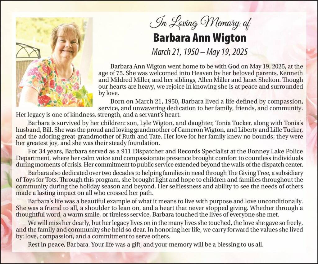 For 34 years, Barbara served as a 911 Dispatcher and Records Specialist at the Bonney Lake Police Department, where her calm voice and compassionate presence brought comfort to countless individuals during moments of crisis.Her commitment to public service extended beyond the walls of the dispatch center.