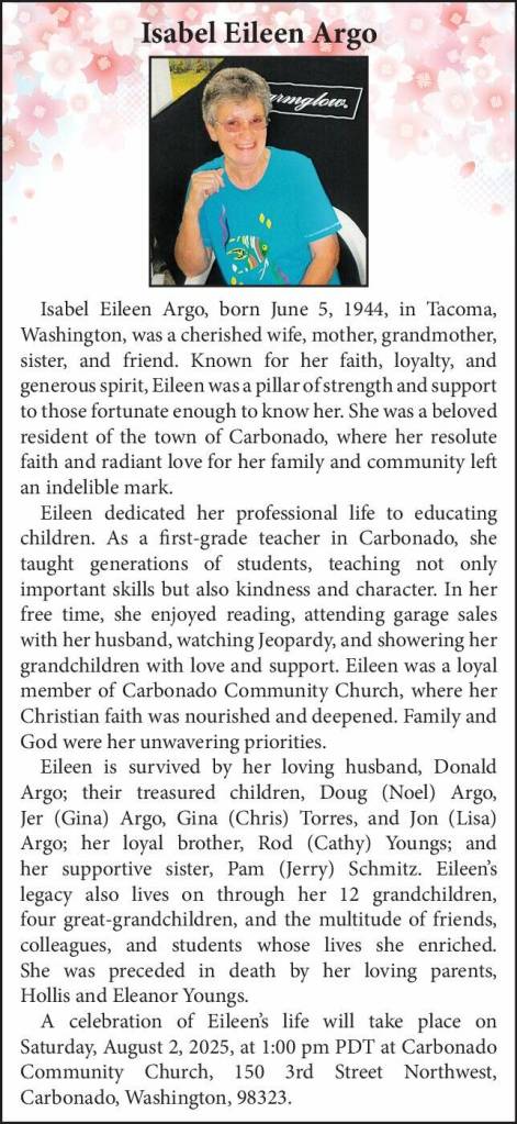 Isabel Eileen Argo, born June 5, 1944, in Tacoma, Washington, was a cherished wife, mother, grandmother, sister, and friend. Known for her faith, loyalty, and generous spirit, Eileen was a pillar of strength and support to those fortunate enough to know her. She was a beloved resident of the town of Carbonado, where her resolute faith and radiant love for her family and community left an indelible mark.