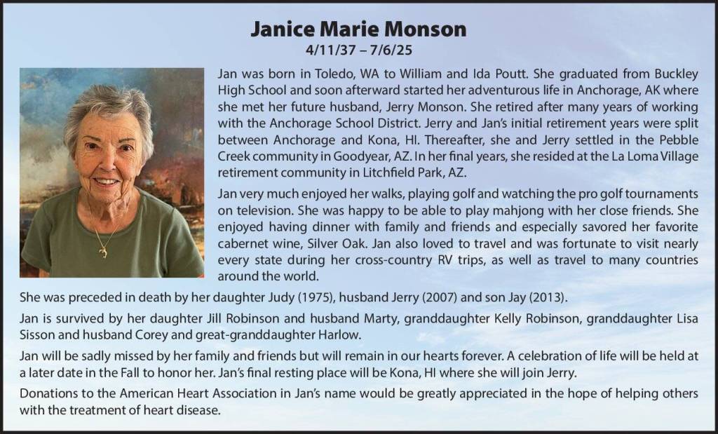 Jan was born in Toledo, WA to William and Ida Poutt. She graduated from Buckley High School and soon afterward started her adventurous life in Anchorage, AK where she met her future husband, Jerry Monson. She retired after many years of working with the Anchorage School District. Jerry and Jan’s initial retirement years were split between Anchorage and Kona, HI. Thereafter, she and Jerry settled in the Pebble Creek community in Goodyear, AZ. In her final years, she resided at the La Loma Village retirement community in Litchfield Park, AZ.
