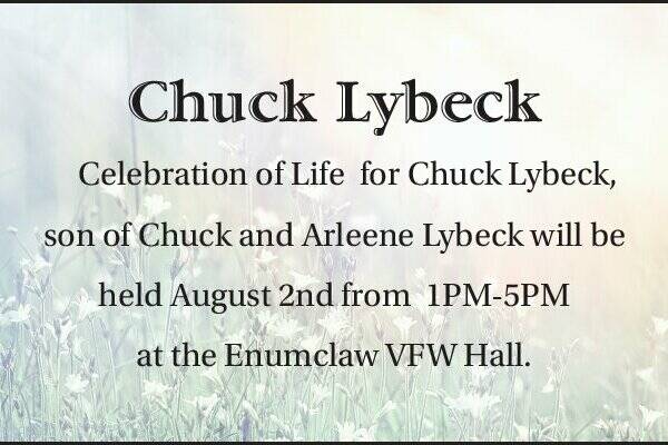 Celebration of Life for Chuck Lybeck, son of Chuck and Arleene Lybeck will be held August 2nd from 1PM-5PM at the Enumclaw VFW Hall.