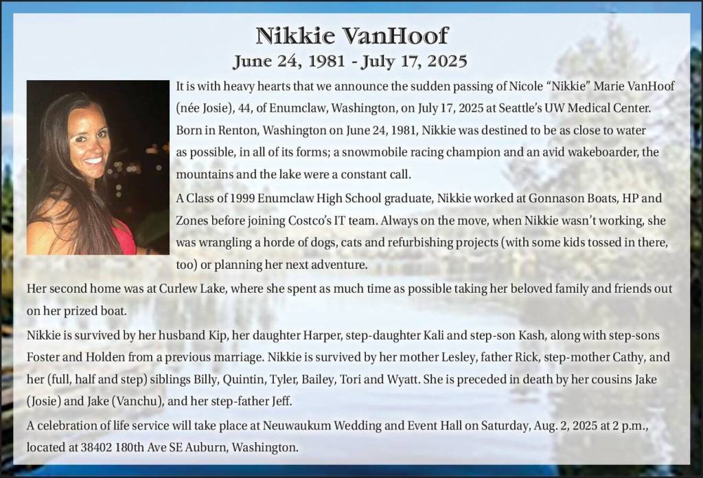 It is with heavy hearts that we announce the sudden passing of Nicole “Nikkie” Marie VanHoof (née Josie), 44, of Enumclaw, Washington, on July 17, 2025 at Seattle’s UW Medical Center.