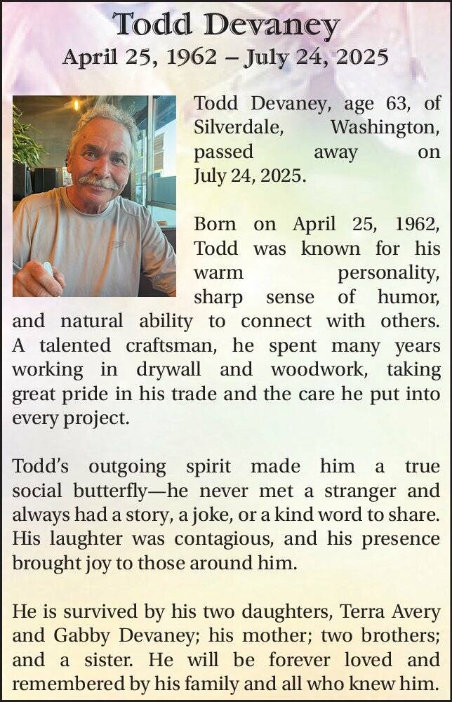 Todd Devaney, age 63, of Silverdale, Washington, passed away on July 24, 2025.