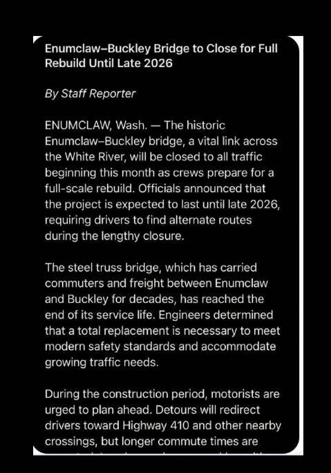 “The historic Enumclaw-Buckley bridge, a vital link across the White River, will be closed to all traffic beginning this month as crews prepare for a full-scale rebuild,” the photo reads, appearing as a “staff report” from an unidentified publication (not The Courier-Herald). “Officials announced that the project is expected to last until late 2026, requiring drivers to find alternate routes during the lengthy closure.”