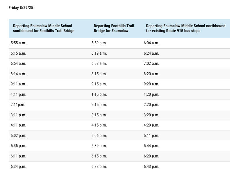 “Across King County, we’re doing everything we can to support the many people impacted by the closure of the White River Bridge,” said Executive Shannon Braddock in a press release. “This extended service between Enumclaw Middle School and the pedestrian-only Foothills Trail Bridge will be a useful link to appointments, family, friends, school, and stores.”