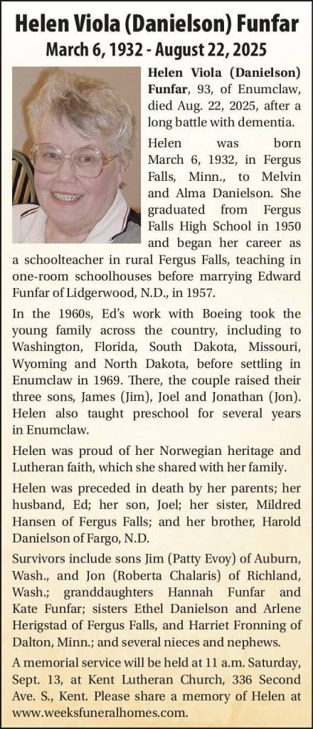 Helen Viola (Danielson) Funfar, 93, of Enumclaw, died Aug. 22, 2025, after a long battle with dementia.