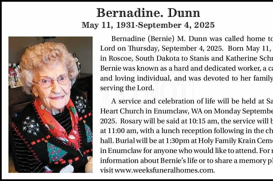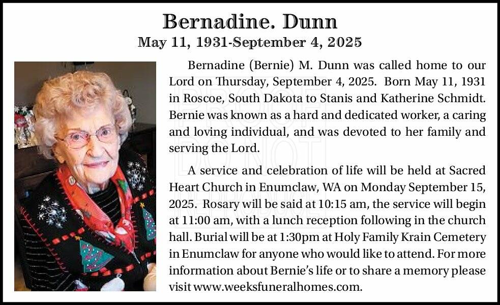 Burial will be at 1:30pm atHoly Family Krain Cemetery in Enumclaw for anyone who would like to attend. For more information about Bernie’s life or to share a memory please visit www.weeksfuneralhomes.com.