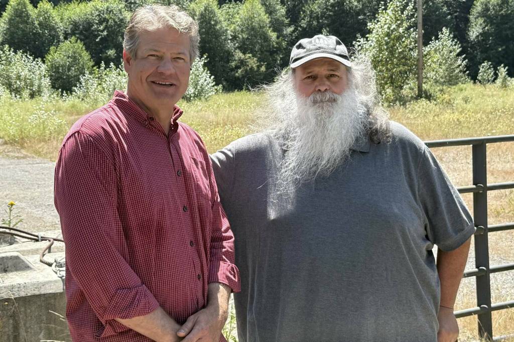 King County Council Vice Chair Reagan Dunn (left) and Bob Baker of Save the Cedar River (right) stand in front of the lot that will no longer be the site of an asphalt plant near the Cedar River. Instead, Dunn hopes to turn it into a public park for land preservation.