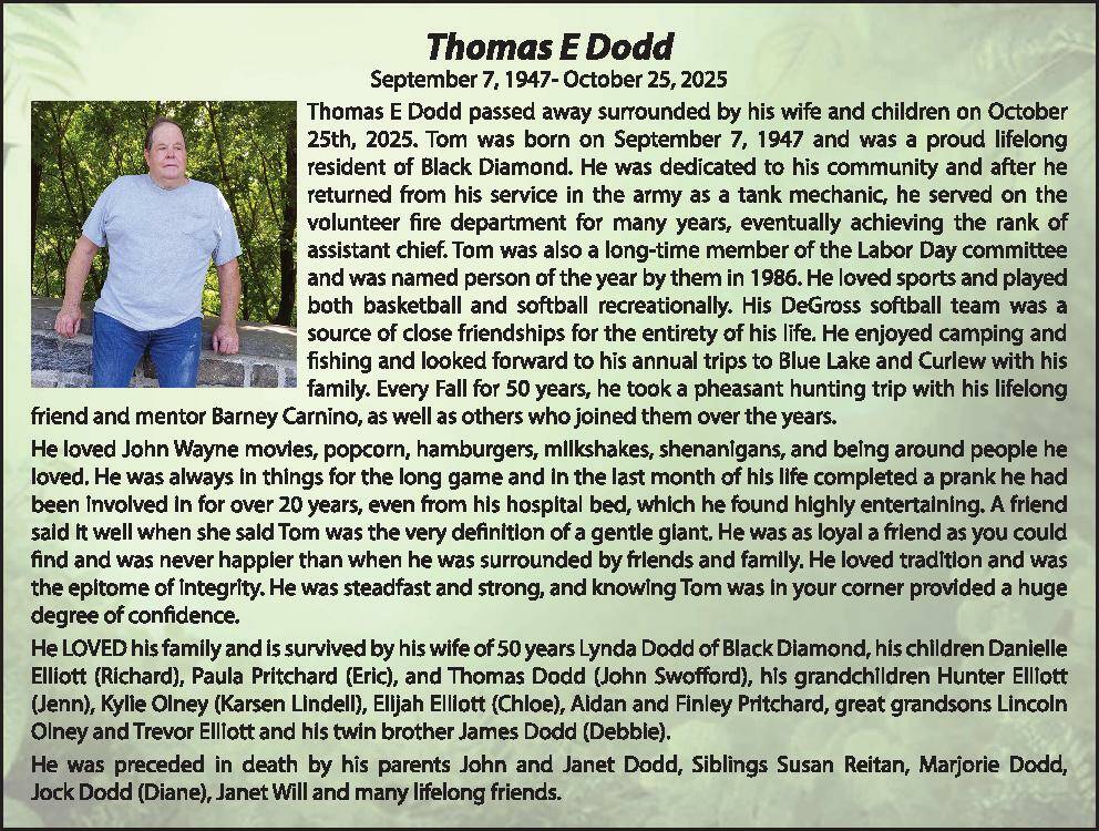 Thomas E. Dodd passed away surrounded by his wife and children on October 25th, 2025. Tom was born on September 7, 1947 and was a proud lifelong resident of Black Diamond. He was dedicated to his community and after he returned from his service in the army as a tank mechanic, he served on the volunteer fire department for many years, eventually achieving the rank of assistant chief. Tom was also a long-time member of the Labor Day committee and was named person of the year by them in 1986. He loved sports and played both basketball and softball recreationally. His DeGross softball team was a source of close friendships for the entirety of his life. He enjoyed camping and fishing and looked forward to his annual trips to Blue Lake and Curlew with his family. Every Fall for 50 years, he took a pheasant hunting trip with his lifelong friend and mentor Barney Carnino, as well as others who joined them over the years.