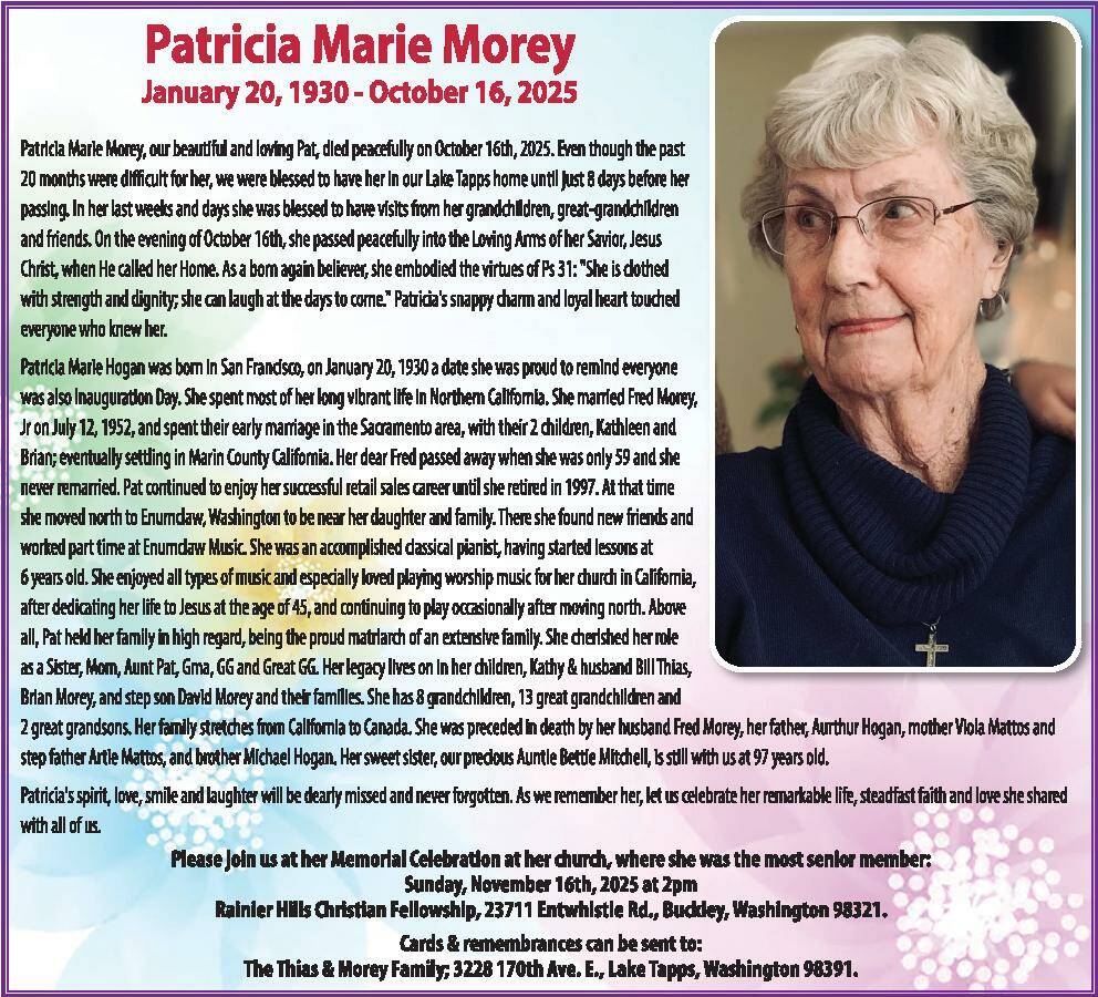 Patricia Marie Morey, our beautiful and loving Pat, died peacefully on October 16th, 2025. Even though the past 20 months were difficult for her, we were blessed to have her in our Lake Tapps home until just 8 days before her passing. In her last weeks and days she was blessed to have visits from her grandchildren, great-grandchildren and friends. On the evening of October 16th, she passed peacefully into the Loving Arms of her Savior, Jesus Christ, when He called her Home. As a born again believer, she embodied the virtues of Ps 31: “She is clothed with strength and dignity; she can laugh at the days to come.” Patricia’s snappy charm and loyal heart touched everyone who knew her.