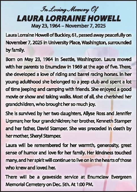 Laura Lorraine Howell of Buckley, 61, passed away peacefully on November 7, 2025 in University Place, Washington, surrounded by family.