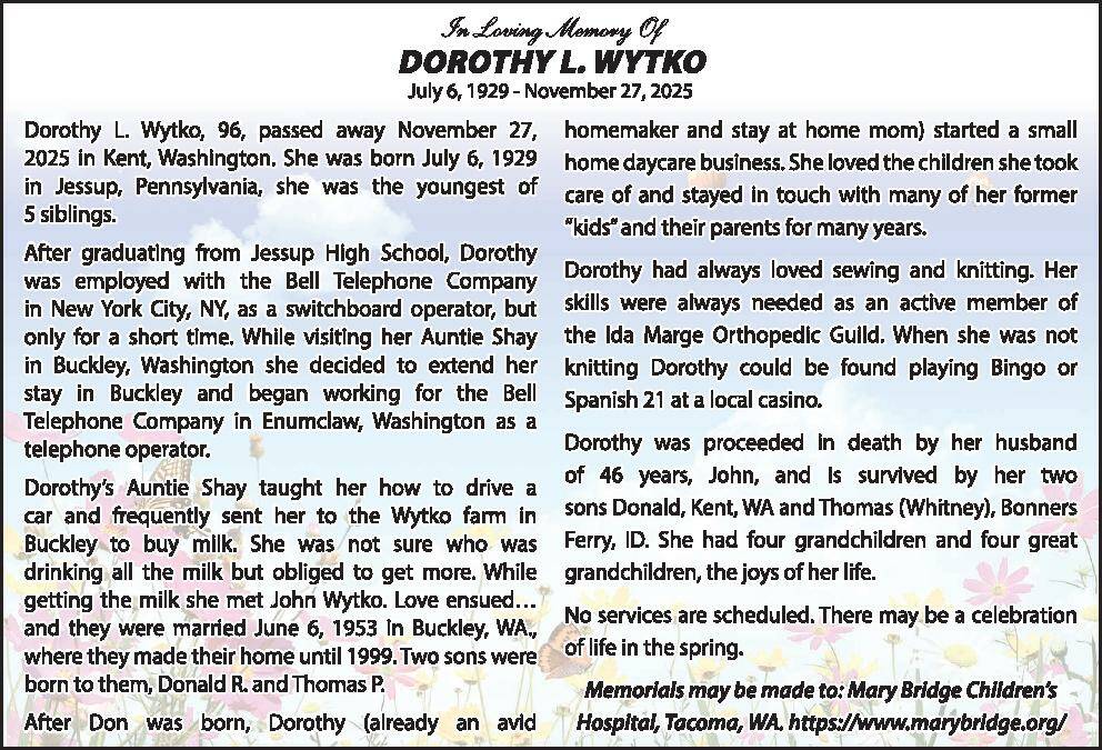 Dorothy L. Wytko, 96, passed away November 27, 2025 in Kent, Washington. She was born July 6, 1929 in Jessup, Pennsylvania, she was the youngest of 5 siblings.
