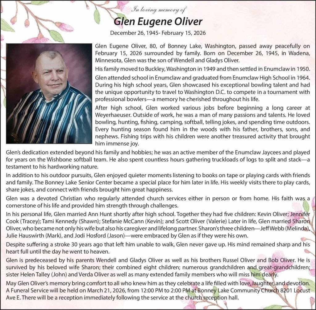 May Glen Oliver’s memory bring comfort to all who knew him as they celebrate a life filled with love, laughter, and devotion. A Funeral Service will be held on March 21, 2026, from 12:00 PM to 2:00 PM at Bonney Lake Community Church 8201 Locust Ave E. There will be a reception immediately following the service at the church reception hall.