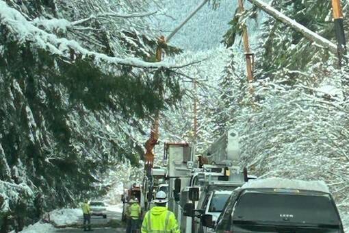 Washington State Department of Transportation maintenance crews removed more than 100 fallen trees from this section of roadway, some tangled in electrical lines along the side of the road. Crews also plowed and treated more than 62 miles of eastbound and westbound lanes.
