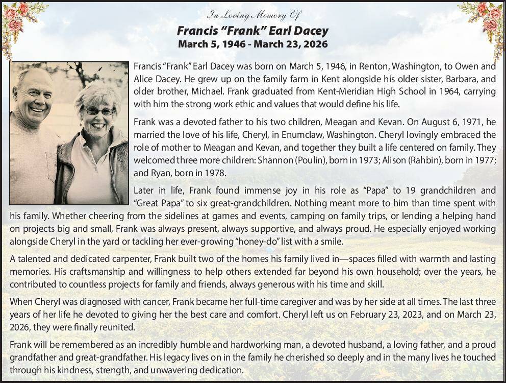 Francis “Frank” Earl Dacey was born on March 5, 1946, in Renton, Washington, to Owen and Alice Dacey. He grew up on the family farm in Kent alongside his older sister, Barbara, and older brother, Michael. Frank graduated from Kent-Meridian High School in 1964, carrying with him the strong work ethic and values that would define his life.
