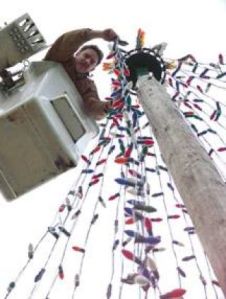 City employees Steve Bergerson (right) and J.C. Rieck spent a chilly morning recently stringing lights for the "tree"…