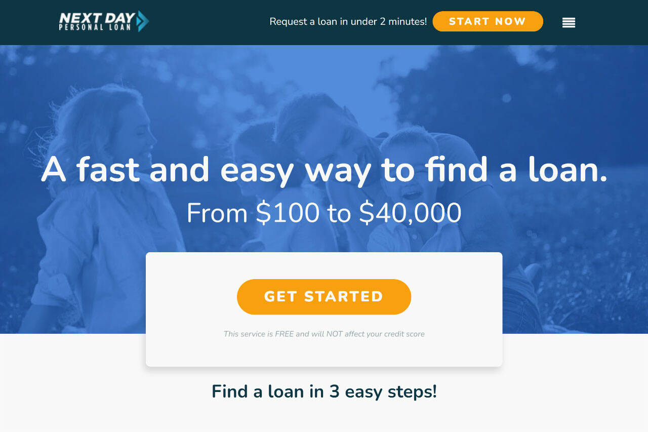 Next Day Personal Loan allows you to get a loan in three simple steps. You only need to complete the official loan form in a couple of minutes, go through it one more time, and put your signature on the documents to get your money as fast as the following business day.