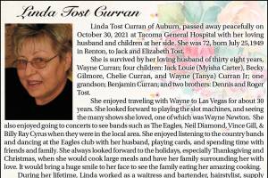 Linda Tost Curran died Oct. 30, 2021, at the age of 72.