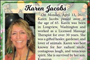 Karen Jacobs died April 13, 2021, at the age of 65.