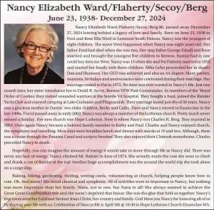 Nancy Elizabeth Ward/Flaherty/Secoy/Berg died Dec. 27, 2025, at the age of 86.