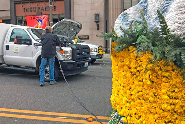 There are the volunteers, who give up evenings and weekends starting in February to plan and build our Sumner float, not to mention decorate it with 15,000 daffodils and other shrubbery the day before the parade. When the parade aired on KOMO4 this year, the announcers praised the creativity of the Sumner float crew! Even more volunteers ride, walk with and drive the float, braving wind, rain and even hail to keep it moving with a smile.