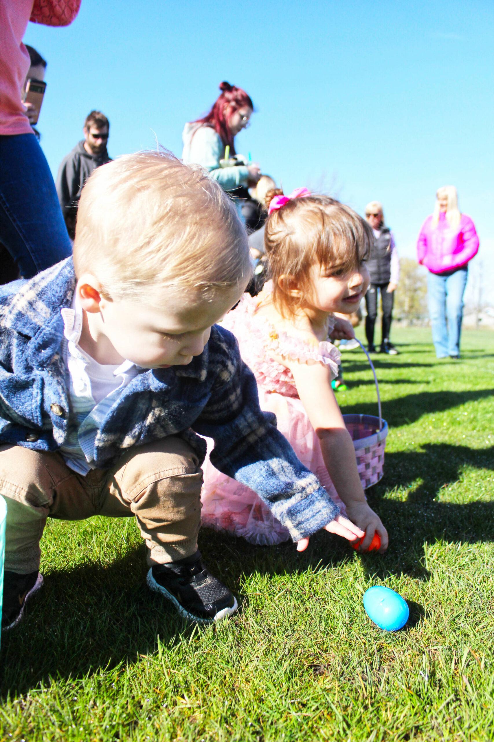 Below, finding a calm spot to grab her eggs is Zuri Jacobs; Luna Gonzalez trying to snatch an egg from another hunter; Randy Jasper, grabbing an egg on the run; and finally, Parker Mounts showing off some of his haul to his parents.