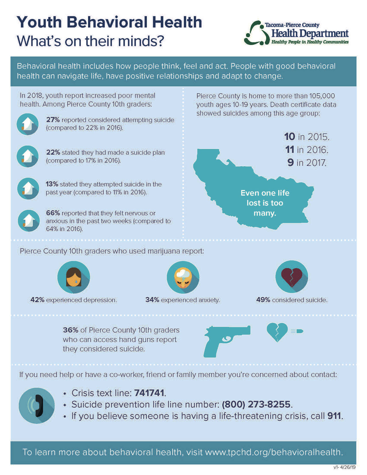 Young people in our county also experience behavioral challenges. According to the 2018 Washington State Healthy Youth Survey, results from Pierce County 10th graders show: