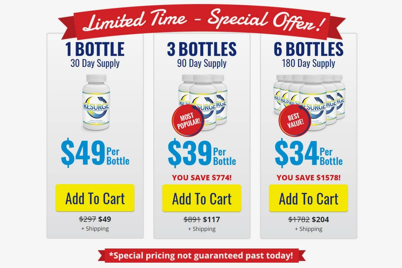 If you are excited about boosting your metabolism and improving your sleep patterns, it’s high time you get yourself Resurge while it is still offered at the lowest price. The good news is that you can save up to $1578 if you purchase your bottles today. Go to the official website, select your preferred package and click the “Add to Cart Button” to purchase Resurge.
