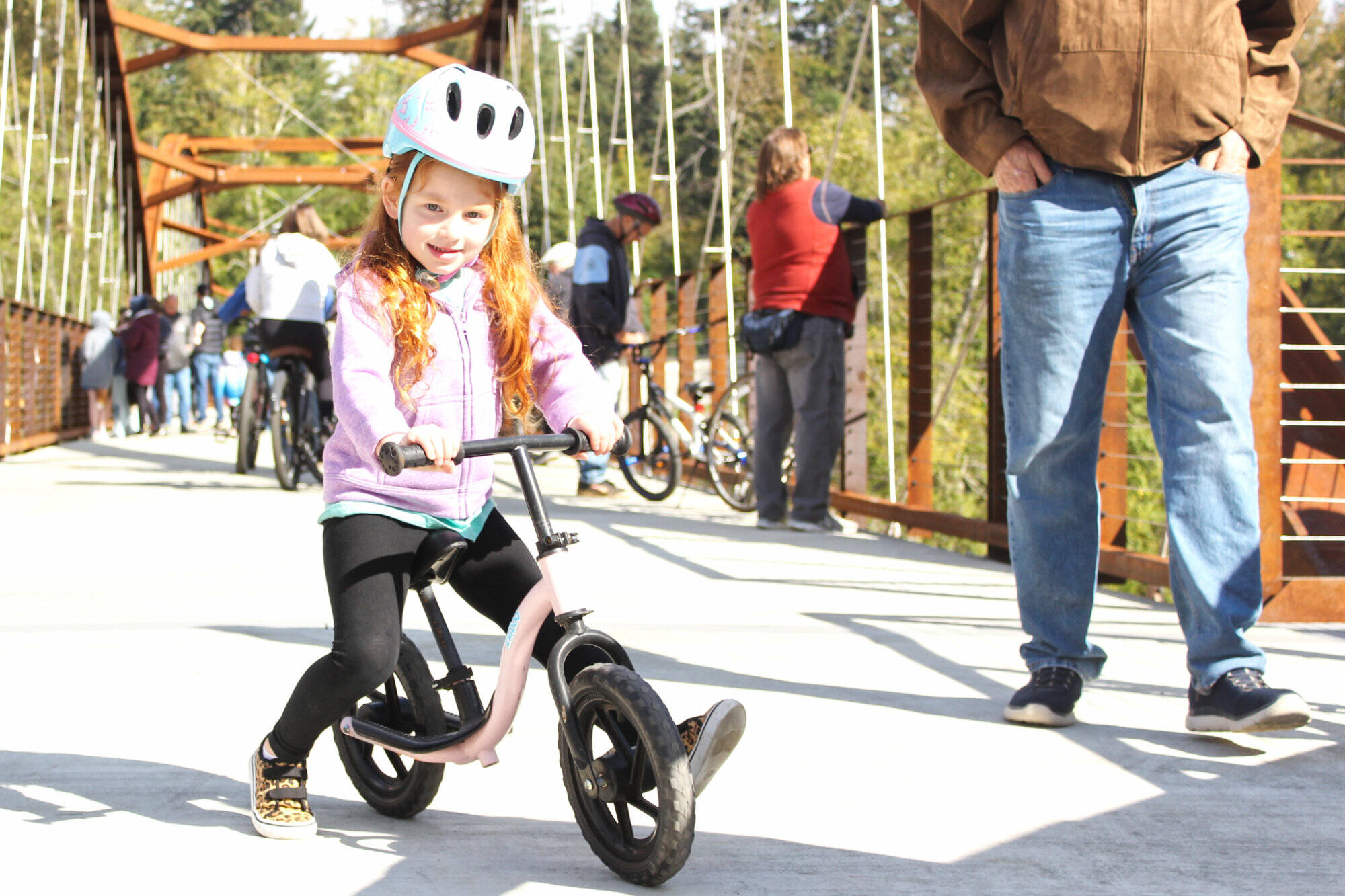 Attending the Sept. 28 grand opening were dozens of locals excited to walk, run, and bike across the 572-foot-long, weathered steel bridge and several elected officials, including King County Deputy Executive Shannon Braddock, King County Councilmember Reagan Dunn, Pierce County Councilmember Dave Morrell, Johnson, Enumclaw Councilmember Anthony Wright, and Rails to Trails Board President Dan Bucci.