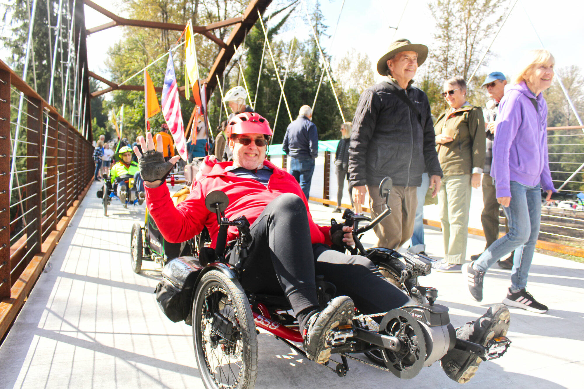 “This trail will make it easier to get where you got to go. With equity and accessibility, this project is particularly special because it addresses historical gaps in regional trail access; many in rural communities like we’re standing in right now, underserved areas, will now have improved access to outdoor spaces… trails like this are vital in creating equitable outdoor opportunities for all residents,” said Pierce County Councilmember Dave Morrell with his bike and decked out in his biking gear. “…This bridge will serve as a lasting symbol of what we can achieve through thoughtful investment in public spaces.”