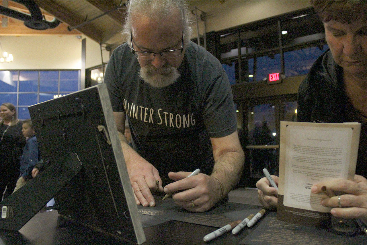 Pictured above are Hunter’s parents, Laura and Atom, who shared stories of their son and thanked the many people who came to remember him.