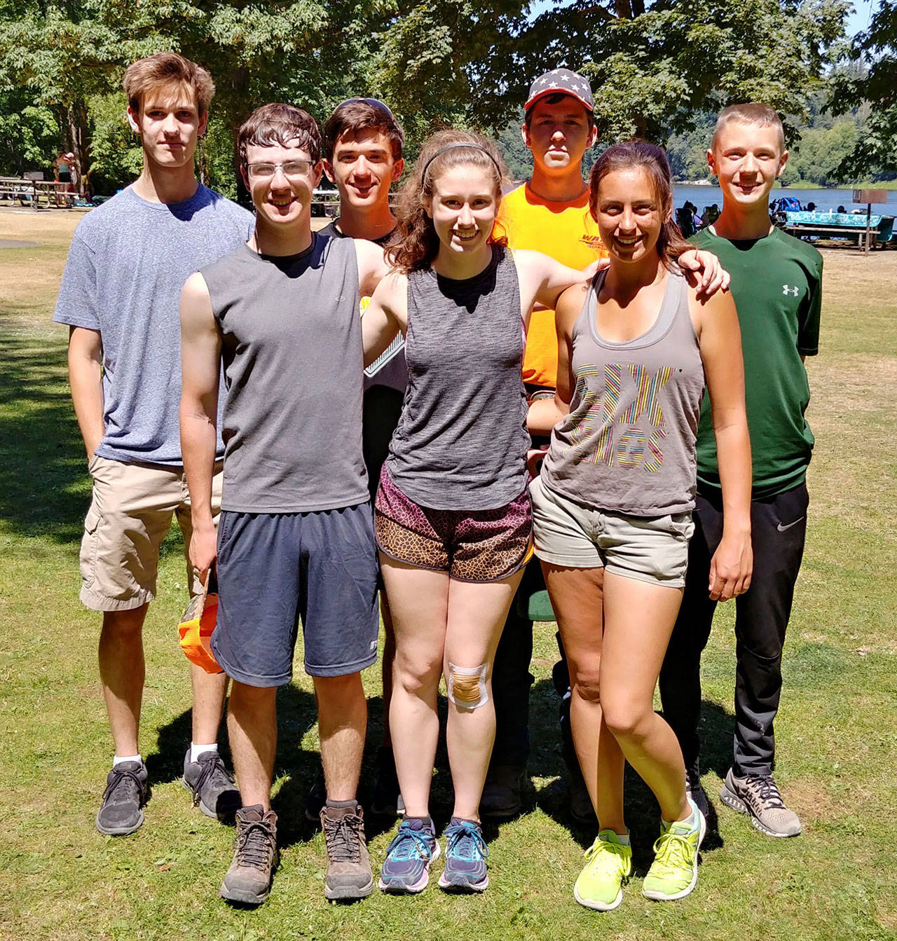 In the lower photo are: in back, Kyle Revell, Dominic Deady, Tyler Watts and Trevor Storm; in front are Ryan Weeks, EHS alum Bryn Zeman-Witzel and Vanessa Sanders.