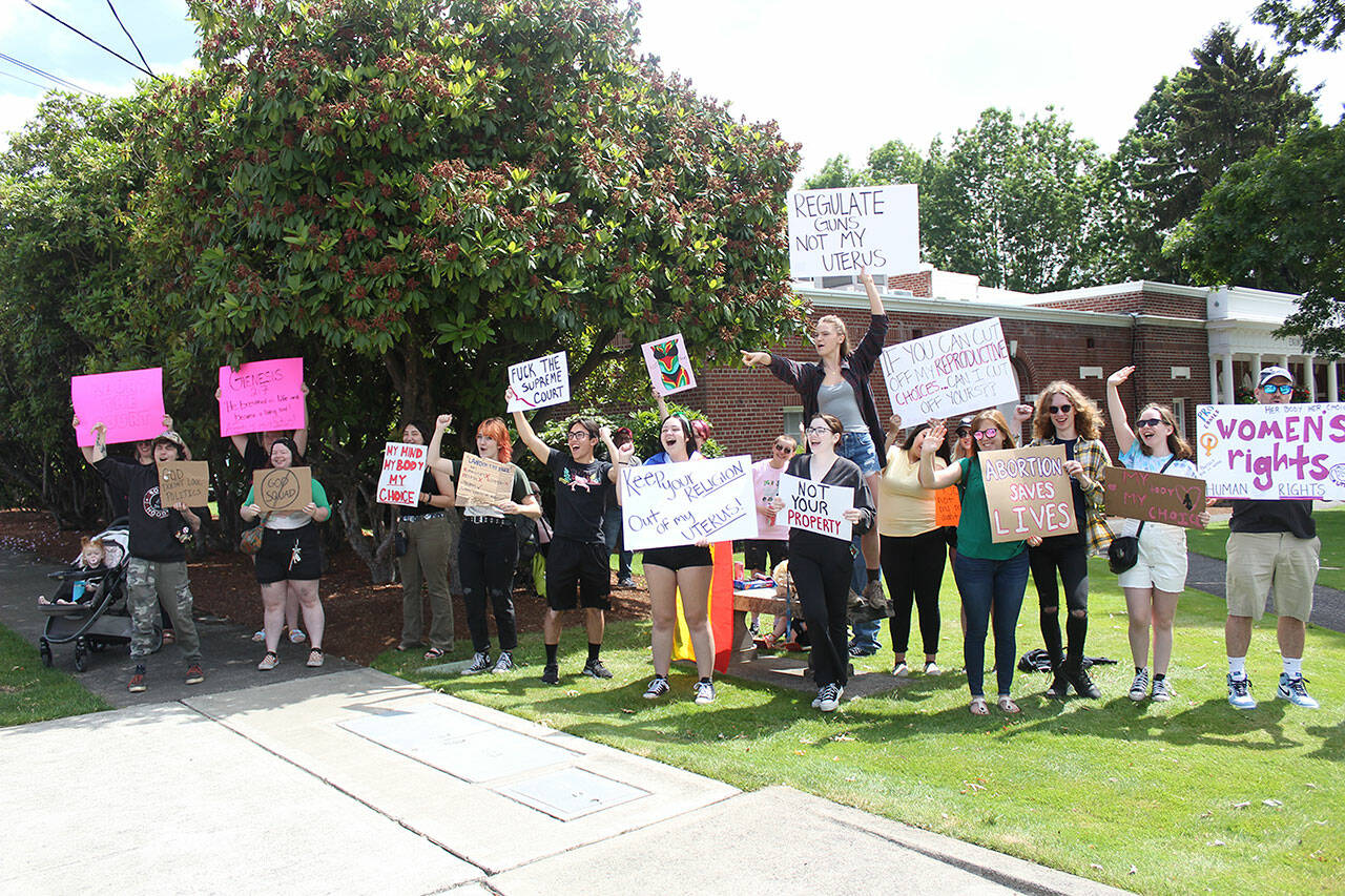More than 50 people — ages 17 to 70 — gathered in front of Enumclaw’s City Hall to protest the Supreme Court’s recent overturning of the legal precedent on abortions set by Roe v. Wade.
