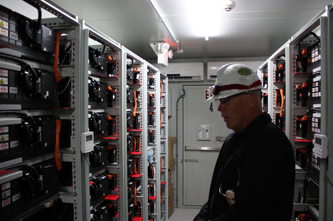 As rain pattered against the exterior of four large shipping containers, inside Paul Jusak, a Puget Sound Energy (PSE) controls engineer, pushed a few buttons an a built-in computer and the thousands of battery cells inside the containers hummed to life. The batteries are charging, and within a few minutes the four containers have charged from 38 to 40 percent. In a matter of seconds, the intake of energy from the power grid can be reversed and sent out to power the town center of Glacier during outages.