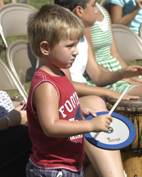 More than 200 children and some parents pounded on drums of all shapes and sizes, along with other percussion instruments as Drumatic Innovations held a community drumming during Kids Club on Aug. 18 at Cedarview Park in Bonney Lake.