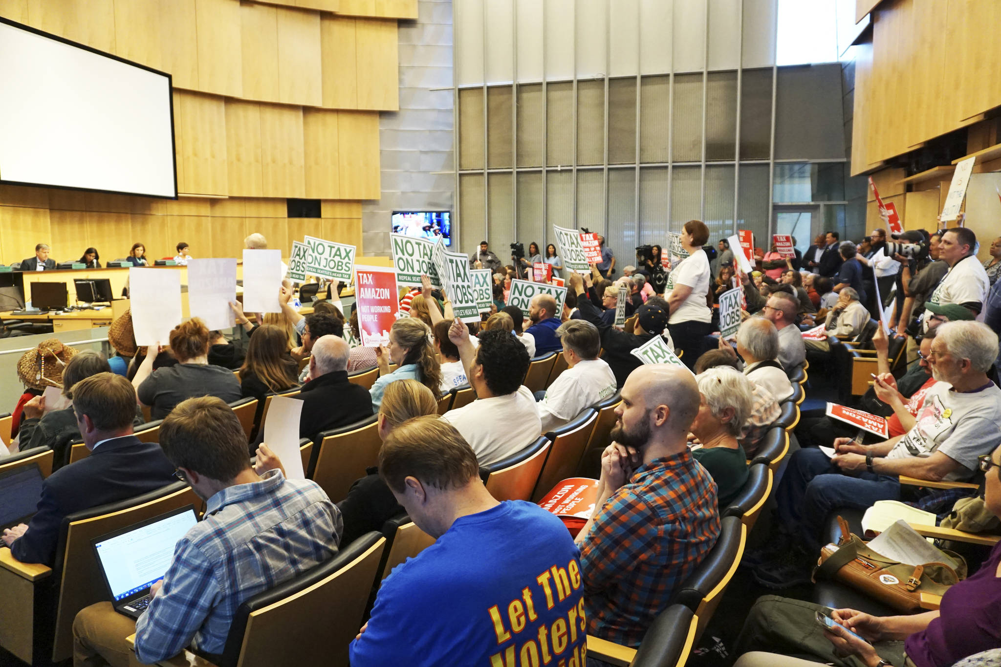 City Hall bustled with activity on Tuesday afternoon as people filed into the chambers to voice their opinions on the head tax repeal. Stationed in the lobby throughout the meeting, a Real Change member hit a gong 6,320 times to represent the number of people sleeping outside in King County. The county’s latest annual point-in-time count released in May revealed that 12,112 people are experiencing homelessness, a four percent increase from last year. Members of the public who opposed the repeal sang the refrain, “Everbody’s got a right to live,” as people filed up the stairs, filling every corner of the chamber. The room was divided by No Tax on Jobs supporters who held white signs seated on the left, and those on the right side who waved red signs in opposition that read: “Tax Amazon/Not Working People.”