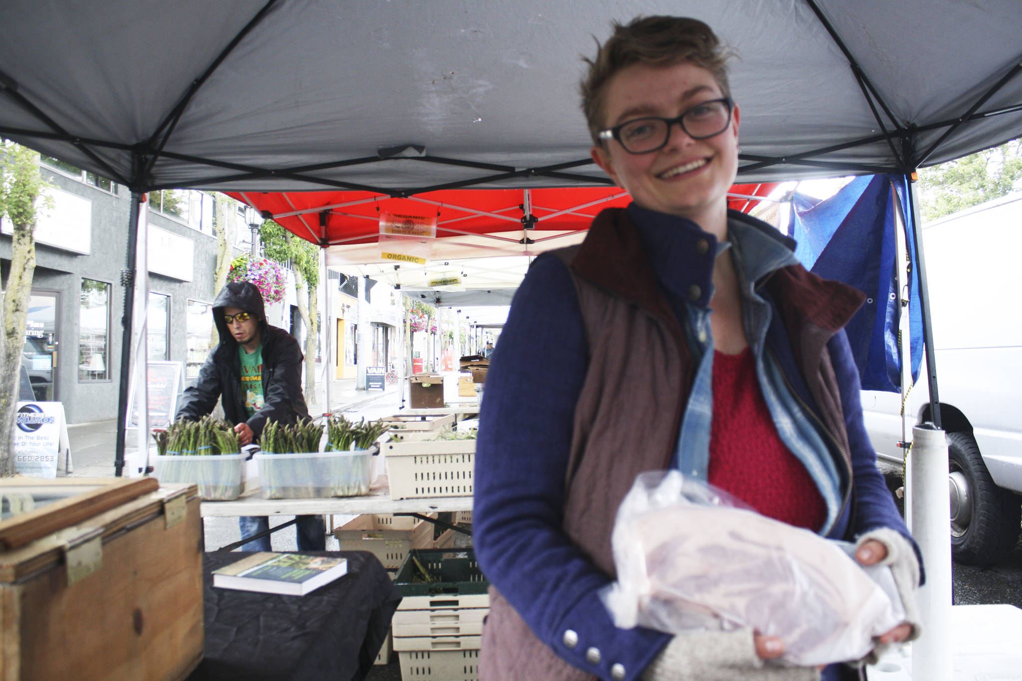 Farmer and vendor Lucia Wyss hurriedly stuffs a wrapped chunk of meat into a white cooler on the ground as she cleans her table at the market’s conclusion. Tucking a gray cash box under one arm, the 24-year-old walks the stretch of glimmering, wet asphalt to the sidewalk where the market manager stands with a clipboard, noting all the vendors’ earnings. Despite the rain that’s drizzled down for much of that morning, it’s been a successful day for Wyss, a co-owner of Hidden River Farms, as about 40 customers bought her entire stash of Canadian bacon, plus a couple of roasts.