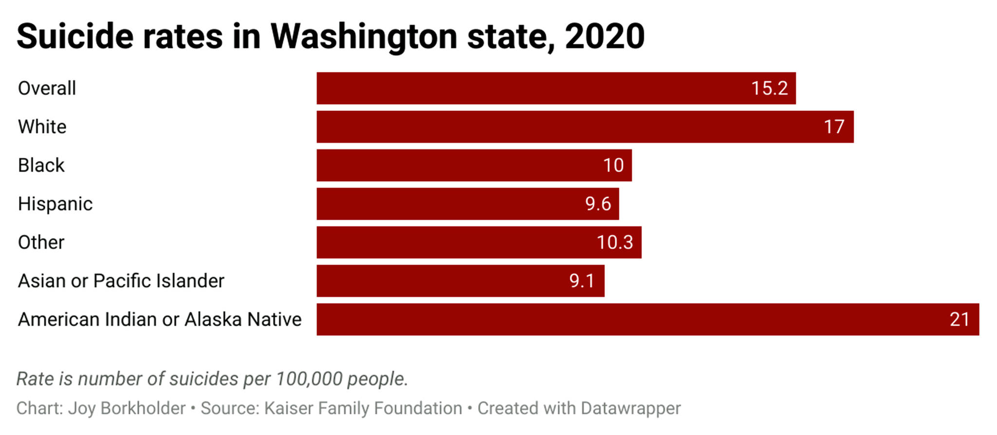 In Washington state, American Indian and Alaska Native people have had a higher suicide rate than all other racial/ethnic groups in nine of the past ten years.