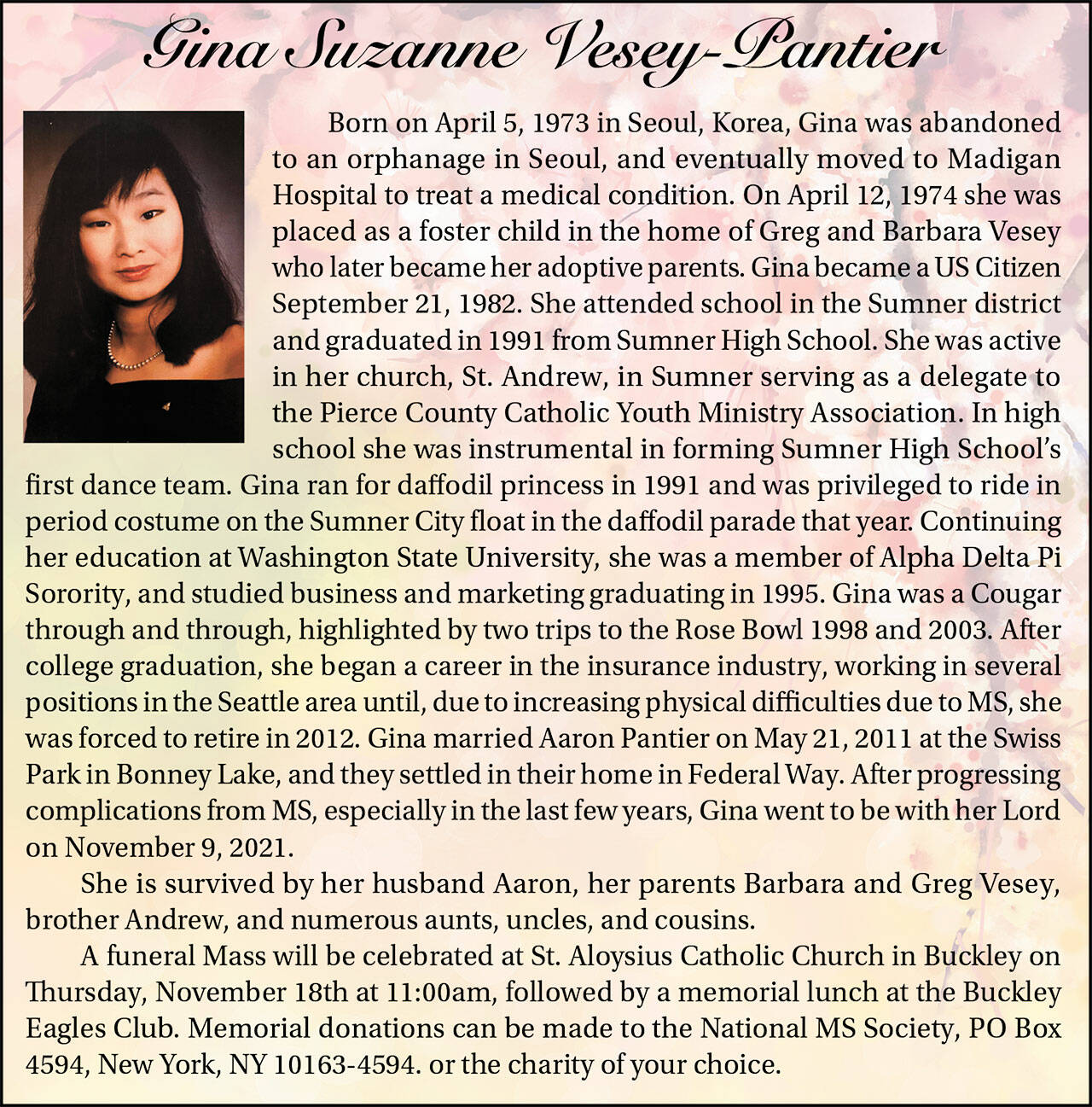 Gina Vesey-Pantier Gina Suzanne Vesey-Pantier died Nov. 9, 2021, at the age of 48. Gina Suzanne Vesey-Pantier died Nov. 9, 2021, at the age of 48.