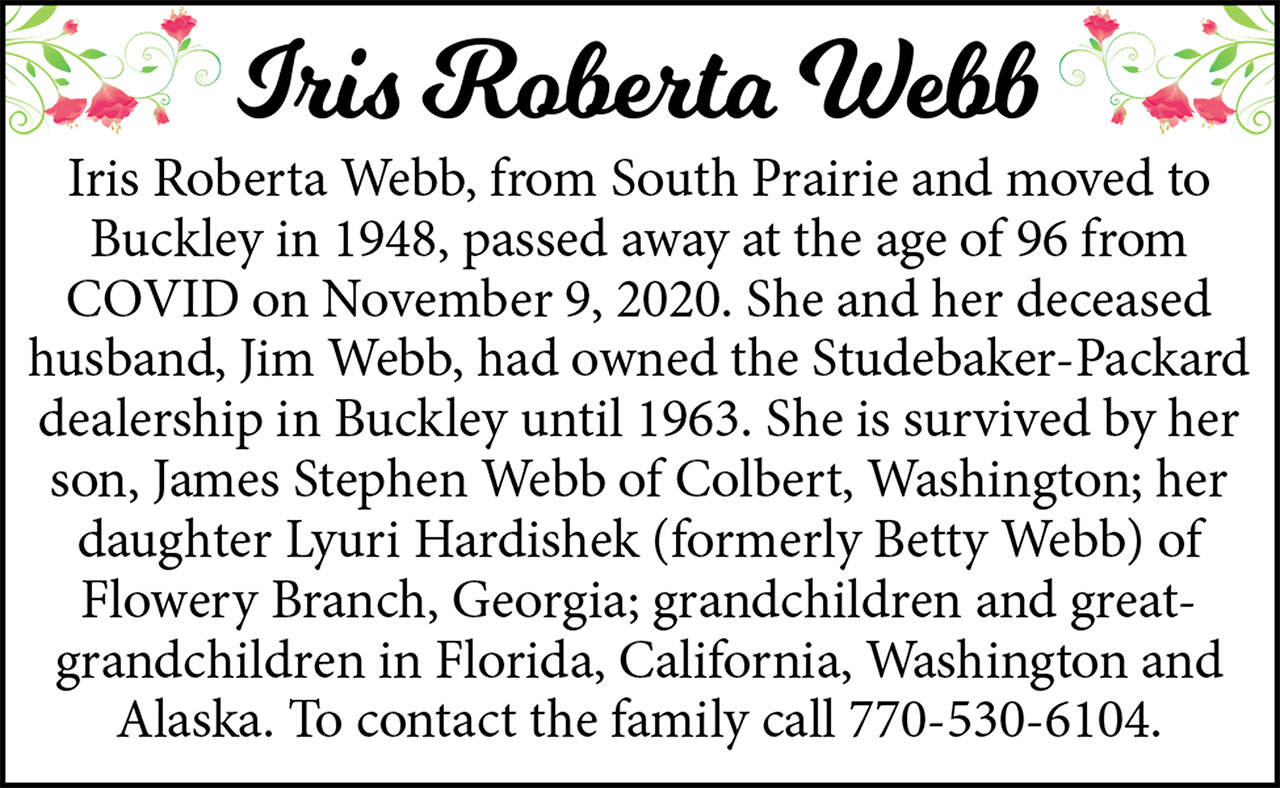 Iris Webb Iris Roberta Webb died Nov. 9, 2020, at the age of 96. Iris Roberta Webb died Nov. 9, 2020, at the age of 96.