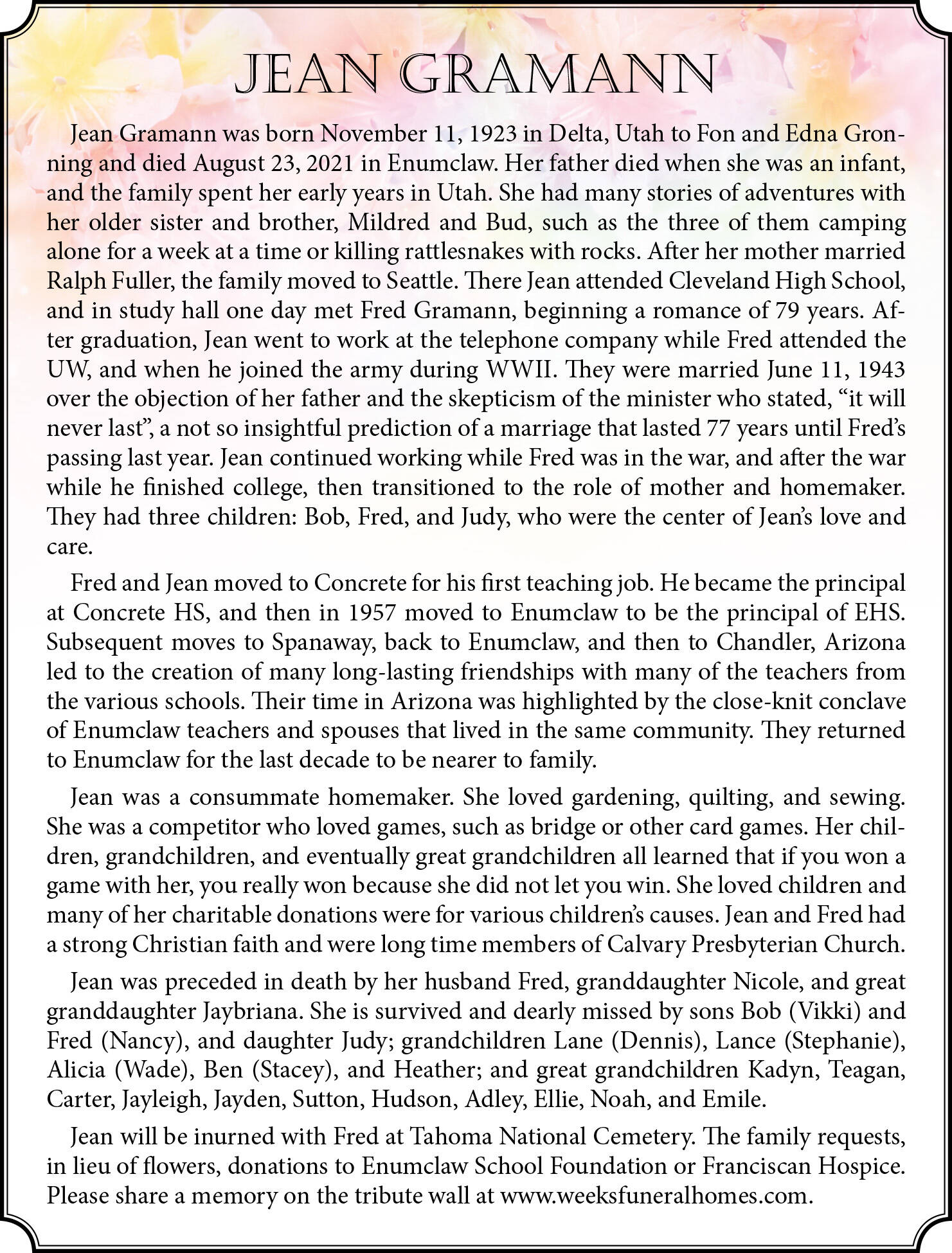 Jean Gramann Jean Gramann died August 23, 2021 at the age of 97. Jean Gramann died August 23, 2021 at the age of 97.