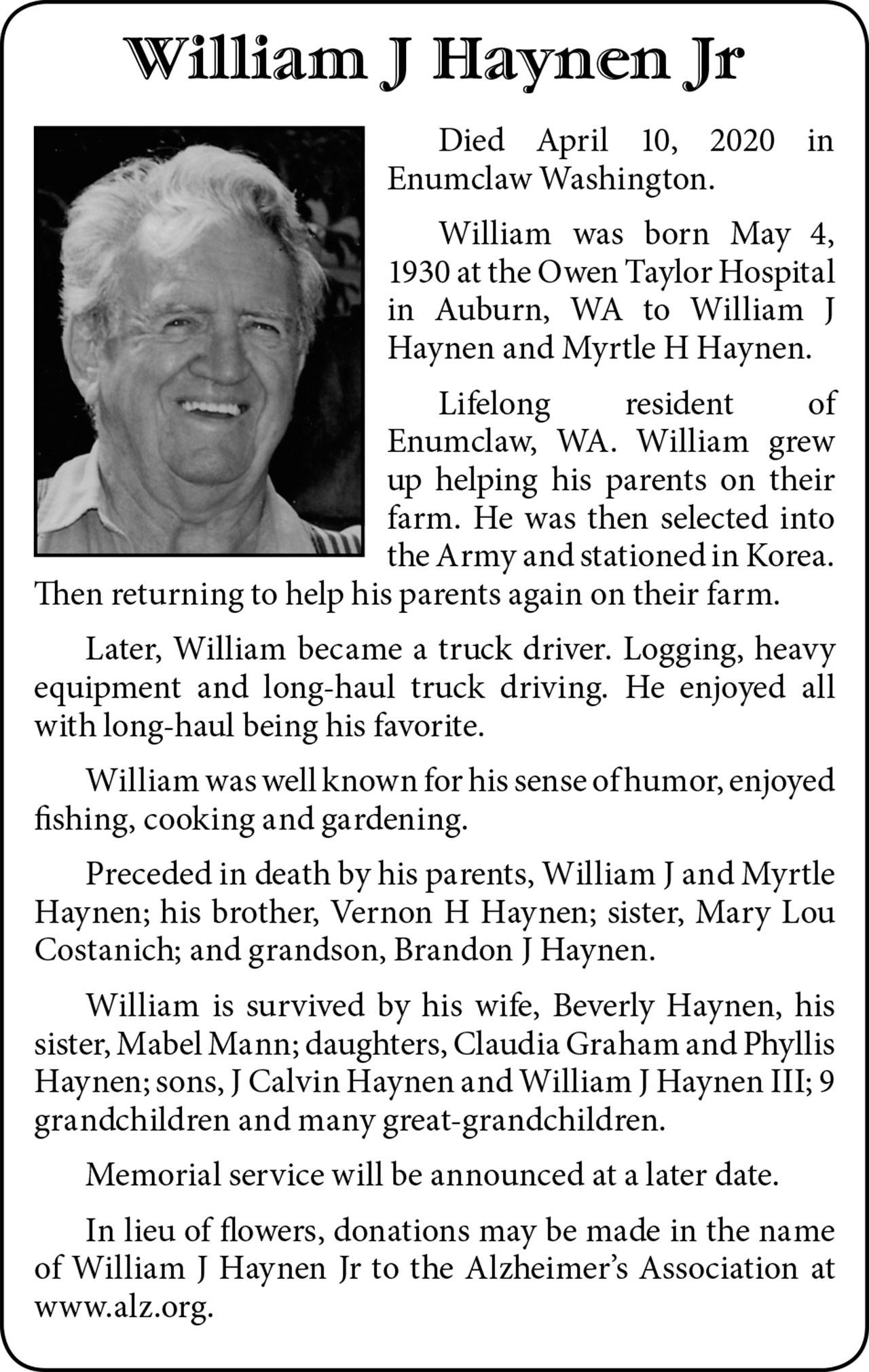 William Haynen William J. Haynen died April 10 at the age of 89. William J. Haynen died April 10 at the age of 89.