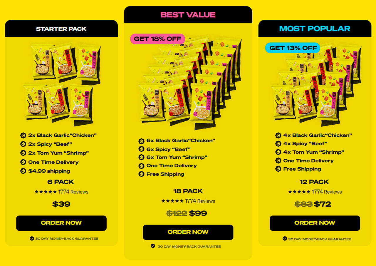 - Eighteen-pack – Six packs of Black Garlic Chicken, six packs of Spicy Beef, six packs of Tom Yum Shrimp, all for $99. Enjoy free shipping with this offer.