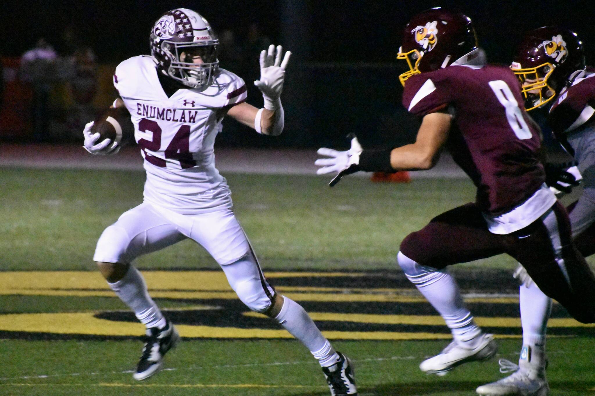 PHOTO BY KEVIN HANSON Enumclaw running back Louis Chevalier (24) looks to fend off White River tacklers led by Ray Palmer (8) during the game’s early stages.
