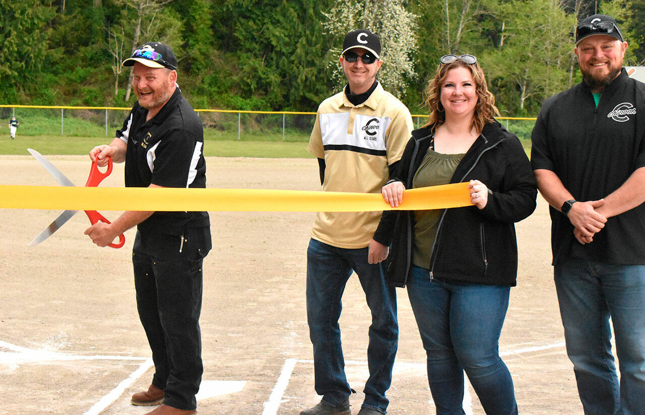 The newly-refurbished Pete’s Pool ballfield was celebrated with a ribbon-cutting ceremony the evening of May 11. Doing the snipping honors, joined by members of the Chinook Little League board of directors, was association president Bruce McCann. Photo by Kevin Hanson
