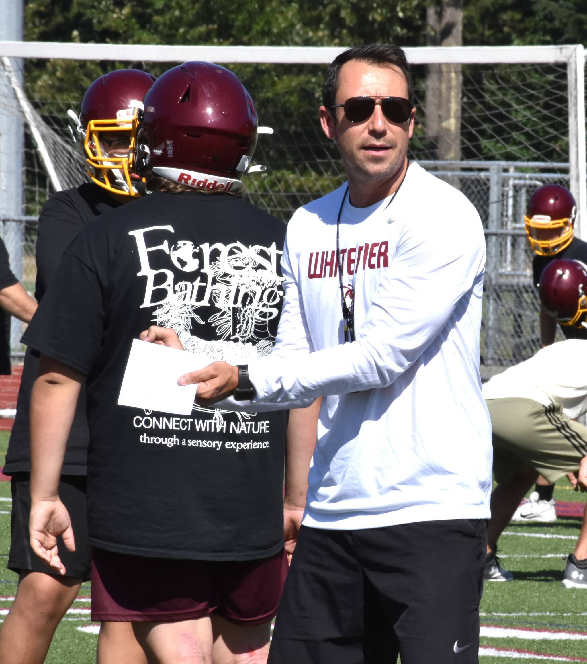Below, new White River coach Wyatt Evenson runs the offense through drills while, on another part of the field, lineman go through their hand-to-hand paces.