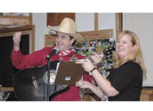Kevin Benedict entertains the crowd at the Bonney Lake Chamber’s annual banquet. Katrina Minton holds the lyric sheet.