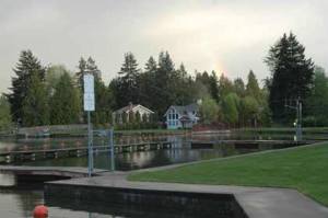 A rainbow peeks out from behind the trees near Allan Yorke Park at the South End of Lake Tapps April 27. Cascade Water Alliance this week announced the lake has reached recreational levels.
