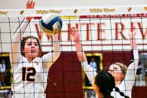 The battle for second place in the South Puget Sound League 2A volleyball standings took place Thursday evening when Enumclaw traveled to White River for the regular-season finale. Both squads entered the contest with 13-2 records, trailing the league champion Washington Patriots.  Both teams will take part in the District 2/3 tournament that runs Friday and Saturday and will send six teams to the Class 2A state tournament in Yakima. In this photo, White River's Kianna Rohner (#12) and Audrey Berg deny EHS a scoring opportunity. Photo by Kevin Hanson