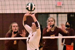 White River senior setter Marissa Dahl begins one of the 54 assists she registered during a Thursday night match against Plateau rival Enumclaw High. Guarding the net for host EHS are Rosie Penke (8) and Macy Furtwangler. Photo by Kevin Hanson